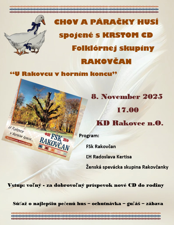 Pozývame na 3. ročník akcie: Chov a páračky husí, na ktorej svoje prvé CD uvedie do hudobného života Folklórna skupina Rakovčan. Akcia sa uskutoční v sobotu 8.11.2025 o 17.00 v KD...