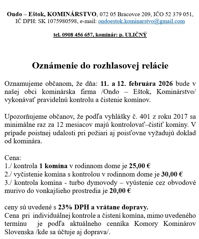 Rakovec nad Ondavou /streda, štvrtok, 11. 2. 2026, 12. 2. 2026/ kontrola a čistenie komínov od rána cca 7:00 - 7:30 hod. , číslo na kominára: 0908 456 657 p. Uličný.
